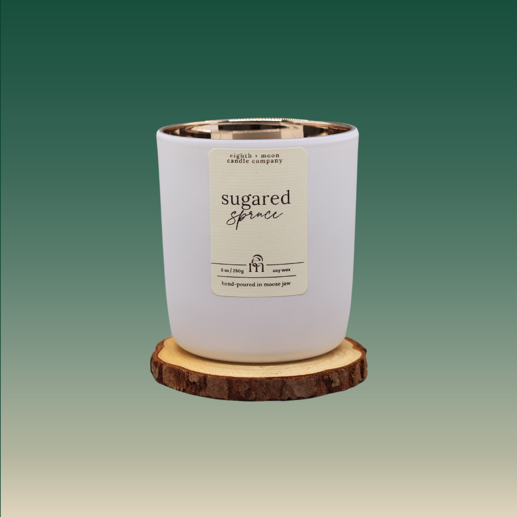 Sugared Spruce is a sweet, fresh blend of pine needles, orange, + strawberry with a generous serving of sugared vanilla!